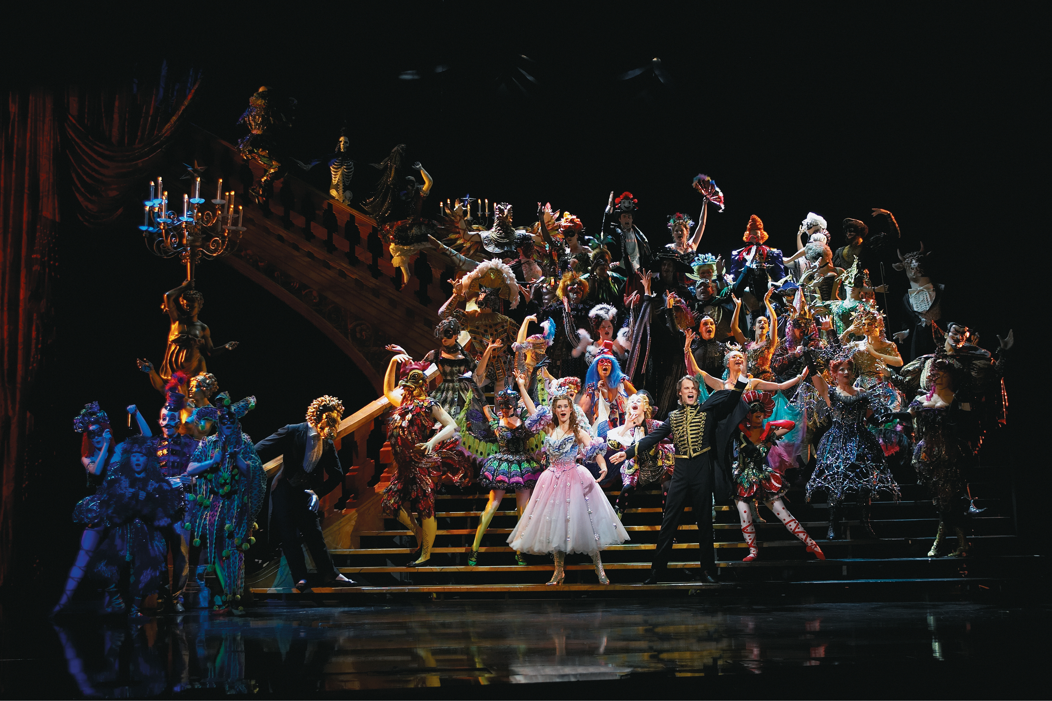 Schon die Ouvertüre ist packend. Während der tonnenschwere Kronleuchter zu fulminanter Orgelmusik in Richtung Decke gezogen wird, kann sich der Zuschauer auf das vorbereiten, was ihn in den nächsten Stunden erwarten wird: Eine Welt aus aufwendigen Kostümen, detailreichen Kulissen und den Mysterien des Untergrundes. Die Vorhänge fallen von den goldenen Statuen und der Glanz der Oper wird erkennbar.
